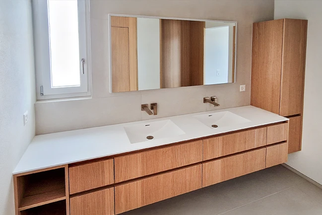 Auch im Bad konnten wir mit individuellen Möbeln und durchdachten Lösungen Akzente setzen. Hochwertige Materialien, präzise Verarbeitung und langlebige Konstruktionen sorgen hier für Funktionalität und zeitloses Design.