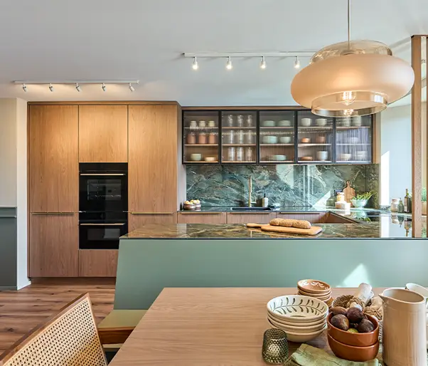 Passend zu dem viergeschossigen Pavillon mussten speziell konzipierte Brandschutz-, WC-, Abschluss- und Turnhallentüren designt, produziert und montiert werden. Diesen Job haben wir übernommen: über 150 Türen für Schulzimmer, Turnhallen, Eingangsbereiche und Gruppenräume wurden bei uns in Bremgarten hergestellt. Es flogen die Späne, als wir mehr als 1‘500 m2 Eichenfurnier verarbeitet haben. Und spannend waren auch die Details: anstelle von herkömmlichen Glasausschnitten wurden in den einen Türen runde, bullaugenartige Gläser eingebaut.